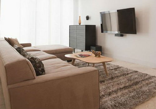 2014客厅装修效果图:小空间里,越少的家具越能给人宽敞的视觉。只要一个大大的沙发,搭配一个圆滑的木质小茶几,这个沙发区宽敞又舒适。挂墙的液晶电视也为地面减轻了负担,旁边的木质收纳柜可以放些常用的客厅用品。这样,一个简洁明快又素雅的客厅就形成了。不过,这样的设计不太适合杂物太多的家庭。