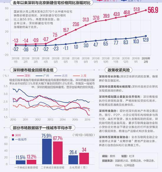 据国家统计局最新发布的70城房价数据显示,2016年2月,深圳房价环比上涨3.6%,同比去年涨幅高达56.9%,均位居全国首位。但从深圳近期房价涨幅、租金回报率及库存等数据来看,其房价走势出现风险信号。同时,“调控收紧”这把达摩克利斯之剑依然高悬。